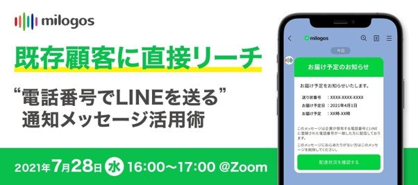 株式会社セプテーニ・データ・ソリューションズ(本社:東京都新宿区、代表取締役: 武藤 政之 )の連結子会社で、LINEを活用したDX(デジタルトランスフォーメーション)支援事業を手掛けるミロゴス株式会社(本社:東京都新宿区、代表取締役:高村 圭、以下「ミロゴス」)は、無料オンラインセミナー「既存顧客に直接リーチ!"電話番号でLINEを送る"通知メッセージ活用術」を7月28日(水)に開催いたします。