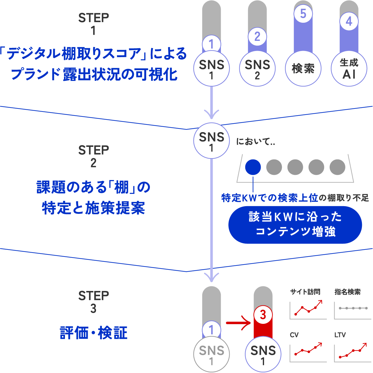 1.検索エンジン・SNS・生成AIにおける統合的なブランド露出状況の可視化とスコアリング: