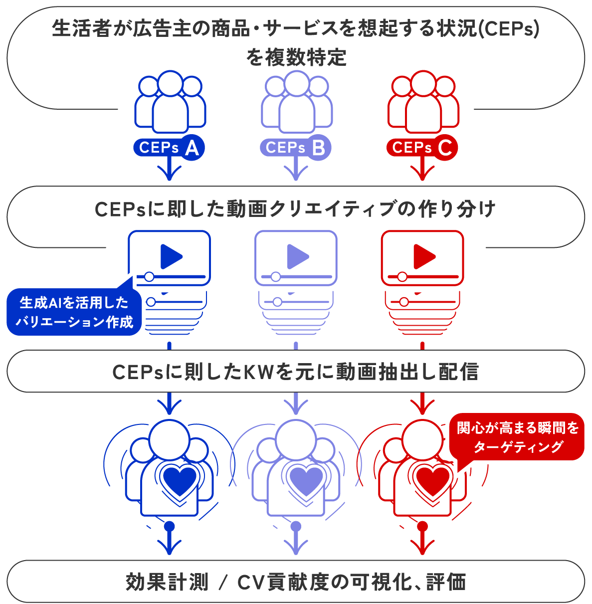 具体的には、まずCEPsを特定し、生成AIを活用してその文脈に合致した動画クリエイティブを質・量共に高めながらスピーディーに制作します。