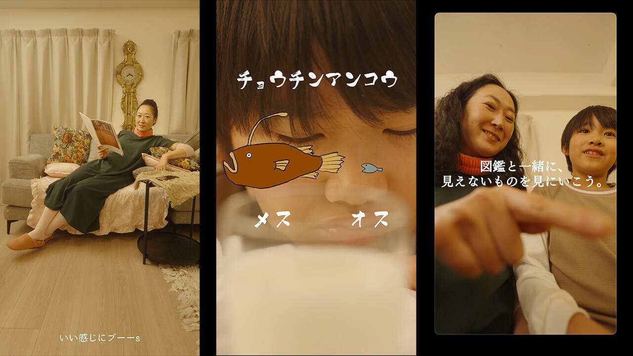 『小学館の図鑑 NEO』を、単なる知識習得ツールではなく、"親子の翻訳装置"として捉え直しました。子どもの成長によって生まれる親子のズレを、図鑑を介して発見し、少しずつ近付けていくストーリーです。ページをめくる発見のリズムを縦型動画のテンポに重ね、縦型ならではの没入感によって、親子の距離が静かに縮まる瞬間を疑似体験できる表現に挑戦しました。