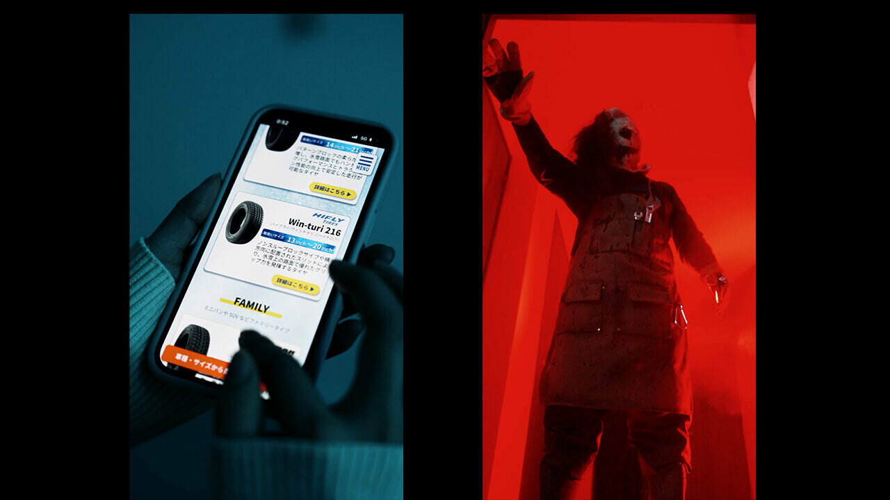オートウェイの強みである「高品質タイヤを、プライスリーダーと呼べる価格でオンライン注文できる」点を知り、輸入タイヤに対する常識が覆った驚きを企画にしました。タイヤが必要な状況にある人物のもとへ、"頼れる存在"のようにタイヤが届くという比喩で、価値を直感的に伝えています。アメリカンホラー風の演出で「タイヤがやって来る」という誇張表現もユーモアとして受け入れられやすくし、「必要なときにすぐに手に入る安心感」を印象付けることを狙いました。
